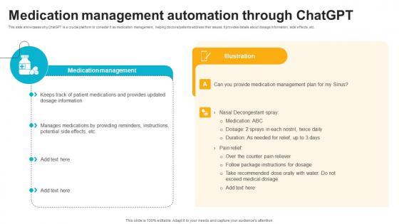 This slide showcases why ChatGPT is a crucial platform to consider it as medication management, helping doctors or patients address their issues. It provides details about dosage information, side effects, etc. The Medication Management Automation Through ChatGPT And Healthcare Innovation Enhancing AI SS V is a compilation of the most recent design trends as a series of slides. It is suitable for any subject or industry presentation, containing attractive visuals and photo spots for businesses to clearly express their messages. This template contains a variety of slides for the user to input data, such as structures to contrast two elements, bullet points, and slides for written information. Slidegeeks is prepared to create an impression. This slide showcases why ChatGPT is a crucial platform to consider it as medication management, helping doctors or patients address their issues. It provides details about dosage information, side effects, etc.