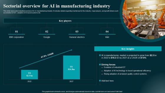 This slide represents industrial overview of AI in manufacturing industry. It includes details regarding market size for the industry, major players, and growth drivers such as evolution of IIoT, adoption of AI-based systems etc. Get a simple yet stunning designed Sectorial Overview For AI In Manufacturing Industry Applications And Impact Download Pdf. It is the best one to establish the tone in your meetings. It is an excellent way to make your presentations highly effective. So, download this PPT today from Slidegeeks and see the positive impacts. Our easy-to-edit Sectorial Overview For AI In Manufacturing Industry Applications And Impact Download Pdf can be your go-to option for all upcoming conferences and meetings. So, what are you waiting for Grab this template today. This slide represents industrial overview of AI in manufacturing industry. It includes details regarding market size for the industry, major players, and growth drivers such as evolution of IIoT, adoption of AI-based systems etc.