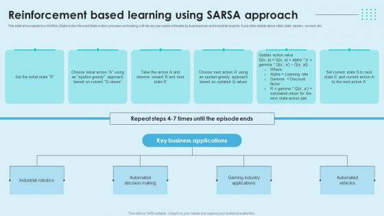 This slide showcases how SARSA State Action Reward State Action process works along with its key use cases referable by businessmen and industrial experts. It provides details about initial state, epsilon, reward, etc. Slidegeeks is one of the best resources for PowerPoint templates. You can download easily and regulate Reinforcement Based Learning Using SARSA Approach Reinforcement Learning Unveiled AI SS V for your personal presentations from our wonderful collection. A few clicks is all it takes to discover and get the most relevant and appropriate templates. Use our Templates to add a unique zing and appeal to your presentation and meetings. All the slides are easy to edit and you can use them even for advertisement purposes. This slide showcases how SARSA State Action Reward State Action process works along with its key use cases referable by businessmen and industrial experts. It provides details about initial state, epsilon, reward, etc.