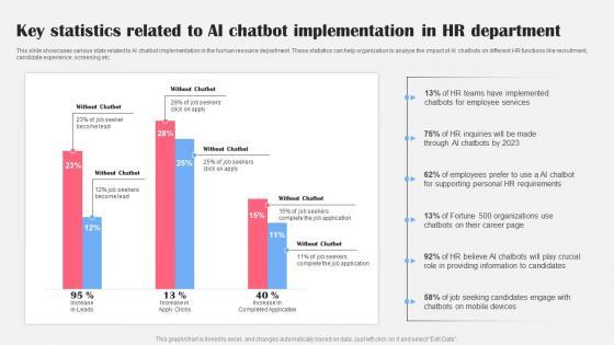This slide showcases various stats related to AI chatbot implementation in the human resource department. These statistics can help organization to analyze the impact of AI chatbots on different HR functions like recruitment, candidate experience, screening etc. Welcome to our selection of the AI Bot Application For Various Industries Key Statistics Related AI Chatbot Elements Pdf. These are designed to help you showcase your creativity and bring your sphere to life. Planning and Innovation are essential for any business that is just starting out. This collection contains the designs that you need for your everyday presentations. All of our PowerPoints are 100 percent editable, so you can customize them to suit your needs. This multi purpose template can be used in various situations. Grab these presentation templates today This slide showcases various stats related to AI chatbot implementation in the human resource department. These statistics can help organization to analyze the impact of AI chatbots on different HR functions like recruitment, candidate experience, screening etc.