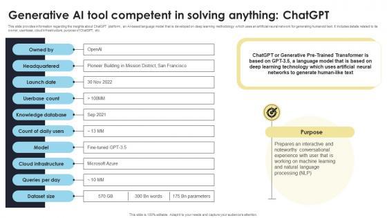 This slide provides information regarding the insights about ChatGPT platform , an AI-based language model that is developed on deep learning methodology which uses an artificial neural network for generating humanoid text. It includes details related to its owner, userbase, cloud infrastructure, purpose of ChatGPT, etc. Retrieve professionally designed Generative AI Tool Competent In Solving Anything ChatGPT How Generative AI Tools Work AI SS V to effectively convey your message and captivate your listeners. Save time by selecting pre-made slideshows that are appropriate for various topics, from business to educational purposes. These themes come in many different styles, from creative to corporate, and all of them are easily adjustable and can be edited quickly. Access them as PowerPoint templates or as Google Slides themes. You do not have to go on a hunt for the perfect presentation because Slidegeeks got you covered from everywhere. This slide provides information regarding the insights about ChatGPT platform , an AI-based language model that is developed on deep learning methodology which uses an artificial neural network for generating humanoid text. It includes details related to its owner, userbase, cloud infrastructure, purpose of ChatGPT, etc.