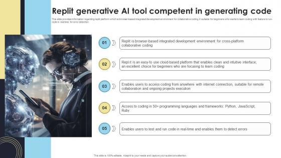 This slide provides information regarding replit platform which is browser-based integrated development environment for collaborative coding. It suitable for beginners who wants to learn coding with feature to run-code in real time for error detection. If you are looking for a format to display your unique thoughts, then the professionally designed Replit Generative AI Tool Competent In How Generative AI Tools Work AI SS V is the one for you. You can use it as a Google Slides template or a PowerPoint template. Incorporate impressive visuals, symbols, images, and other charts. Modify or reorganize the text boxes as you desire. Experiment with shade schemes and font pairings. Alter, share or cooperate with other people on your work. Download Replit Generative AI Tool Competent In How Generative AI Tools Work AI SS V and find out how to give a successful presentation. Present a perfect display to your team and make your presentation unforgettable. This slide provides information regarding replit platform which is browser-based integrated development environment for collaborative coding. It suitable for beginners who wants to learn coding with feature to run-code in real time for error detection.