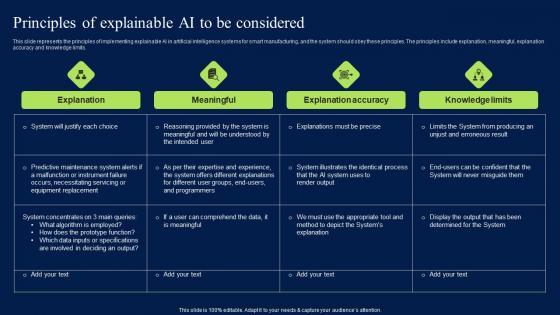 This slide represents the principles of implementing explainable AI in artificial intelligence systems for smart manufacturing, and the system should obey these principles. The principles include explanation, meaningful, explanation accuracy and knowledge limits. Explore a selection of the finest Deploying Ai To Enhance Principles Of Explainable Ai To Be Considered Microsoft PDF here. With a plethora of professionally designed and pre-made slide templates, you can quickly and easily find the right one for your upcoming presentation. You can use our Deploying Ai To Enhance Principles Of Explainable Ai To Be Considered Microsoft PDF to effectively convey your message to a wider audience. Slidegeeks has done a lot of research before preparing these presentation templates. The content can be personalized and the slides are highly editable. Grab templates today from Slidegeeks.