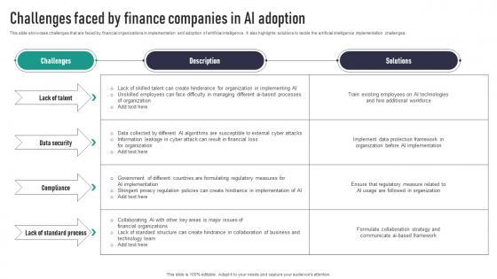 This slide showcase challenges that are faced by financial organizations in implementation and adoption of artificial intelligence. It also highlights solutions to tackle the artificial intelligence implementation challenges. Explore a selection of the finest Challenges Faced By Finance Companies In AI Adoption Introduction Pdf here. With a plethora of professionally designed and pre-made slide templates, you can quickly and easily find the right one for your upcoming presentation. You can use our Challenges Faced By Finance Companies In AI Adoption Introduction Pdf to effectively convey your message to a wider audience. Slidegeeks has done a lot of research before preparing these presentation templates. The content can be personalized and the slides are highly editable. Grab templates today from Slidegeeks. This slide showcase challenges that are faced by financial organizations in implementation and adoption of artificial intelligence. It also highlights solutions to tackle the artificial intelligence implementation challenges.