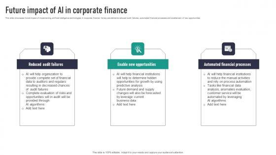 This slide showcases future impact of implementing artificial intelligence technologies in corporate finance. Its key are elements reduced audit failures, automated financial processes and enablement of new opportunities. The Future Impact Of AI In Corporate Finance Professional Pdf is a compilation of the most recent design trends as a series of slides. It is suitable for any subject or industry presentation, containing attractive visuals and photo spots for businesses to clearly express their messages. This template contains a variety of slides for the user to input data, such as structures to contrast two elements, bullet points, and slides for written information. Slidegeeks is prepared to create an impression. This slide showcases future impact of implementing artificial intelligence technologies in corporate finance. Its key are elements reduced audit failures, automated financial processes and enablement of new opportunities.