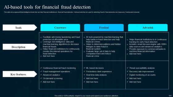 Presenting this set of slides with name ai high tech powerpoint templates ai in banking for fraud detection ppt show slide download pdf. This is a eight stage process. The stages in this process are auth request, transaction and score, case information, expert rules execute, auth recommendation, case creation rules execute, analyst workstation, configuration workstation. This is a completely editable PowerPoint presentation and is available for immediate download. Download now and impress your audience.