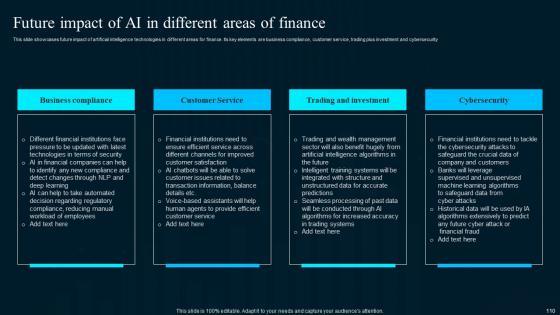 Deploy this Artificial Intelligence Applications In Finance And Banking Ppt Powerpoint Presentation Complete Deck and keep track of activities associated with your business project. Create a list of processes that require urgent completion, rank them in order of priority and monitor progress. Use this ready-made one hundred nineteen-slide complete deck to highlight tasks that need to be completed for that perfect execution of a business project or idea. The presentation template is also equipped to do this with its 100 precent editable and customizable capability. Download now. Our Artificial Intelligence Applications In Finance And Banking Ppt Powerpoint Presentation Complete Deck are topically designed to provide an attractive backdrop to any subject. Use them to look like a presentation pro.