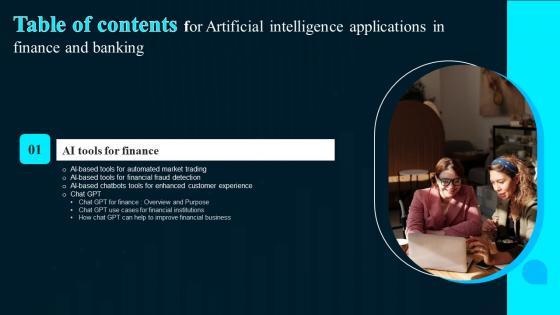 Slidegeeks has constructed Artificial Intelligence Applications In Finance And Banking Table Of Contents Information Pdf after conducting extensive research and examination. These presentation templates are constantly being generated and modified based on user preferences and critiques from editors. Here, you will find the most attractive templates for a range of purposes while taking into account ratings and remarks from users regarding the content. This is an excellent jumping-off point to explore our content and will give new users an insight into our top-notch PowerPoint Templates. Our Artificial Intelligence Applications In Finance And Banking Table Of Contents Information Pdf are topically designed to provide an attractive backdrop to any subject. Use them to look like a presentation pro.
