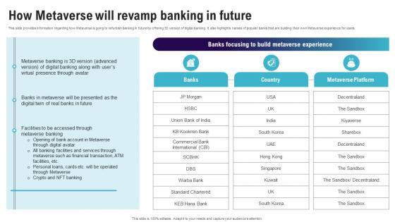 This slide provides information regarding how Metaverse is going to refurbish banking in future by offering 3D version of digital banking. It also highlights names of popular banks that are building their own Metaverse experience for users. Take your projects to the next level with our ultimate collection of How Metaverse Will Revamp Banking In Future Continuum Of Technology Revamping Business AI SS V. Slidegeeks has designed a range of layouts that are perfect for representing task or activity duration, keeping track of all your deadlines at a glance. Tailor these designs to your exact needs and give them a truly corporate look with your own brand colors they will make your projects stand out from the rest This slide provides information regarding how Metaverse is going to refurbish banking in future by offering 3D version of digital banking. It also highlights names of popular banks that are building their own Metaverse experience for users.