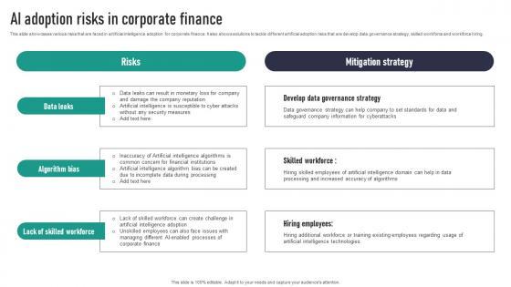 This slide showcases various risks that are faced in artificial intelligence adoption for corporate finance. It also shows solutions to tackle different artificial adoption risks that are develop data governance strategy, skilled workforce and workforce hiring.Boost your pitch with our creative Ai Adoption Risks In Corporate Finance Artificial Intelligence Applications Infographics Pdf. Deliver an awe-inspiring pitch that will mesmerize everyone. Using these presentation templates you will surely catch everyones attention. You can browse the ppts collection on our website. We have researchers who are experts at creating the right content for the templates. So you do not have to invest time in any additional work. Just grab the template now and use them. This slide showcases various risks that are faced in artificial intelligence adoption for corporate finance. It also shows solutions to tackle different artificial adoption risks that are develop data governance strategy, skilled workforce and workforce hiring.