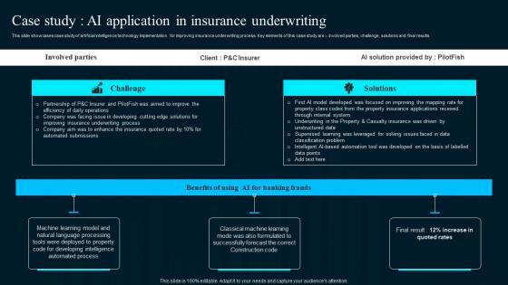 This slide showcases case study of artificial intelligence technology implementation for improving insurance underwriting process. Key elements of this case study are involved parties, challenge, solutions and final results The best PPT templates are a great way to save time, energy, and resources. Slidegeeks have 100 percent editable powerpoint slides making them incredibly versatile. With these quality presentation templates, you can create a captivating and memorable presentation by combining visually appealing slides and effectively communicating your message. Download Ways Artificial Intelligence Is Transforming Finance Sector Case Study AI Application In Insurance Download PDF from Slidegeeks and deliver a wonderful presentation.
