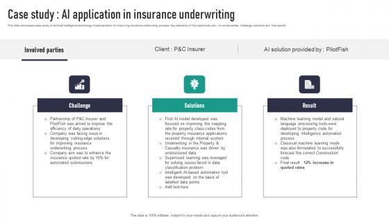 This slide showcases case study of artificial intelligence technology implementation for improving insurance underwriting process. Key elements of this case study are involved parties, challenge, solutions and final results. Welcome to our selection of the Case Study AI Application In Insurance Underwriting Mockup Pdf. These are designed to help you showcase your creativity and bring your sphere to life. Planning and Innovation are essential for any business that is just starting out. This collection contains the designs that you need for your everyday presentations. All of our PowerPoints are 100 percent editable, so you can customize them to suit your needs. This multi-purpose template can be used in various situations. Grab these presentation templates today This slide showcases case study of artificial intelligence technology implementation for improving insurance underwriting process. Key elements of this case study are involved parties, challenge, solutions and final results.