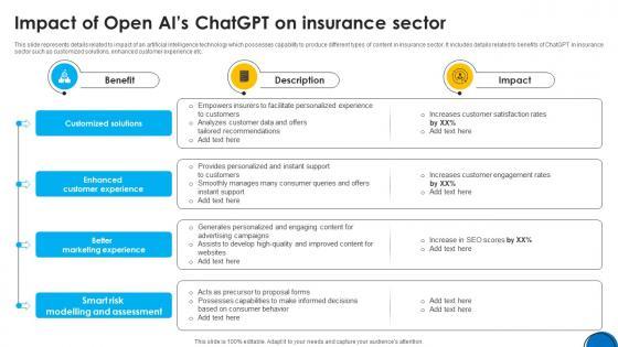 This slide represents details related to impact of an artificial intelligence technology which possesses capability to produce different types of content in insurance sector. It includes details related to benefits of ChatGPT in insurance sector such as customized solutions, enhanced customer experience etc. Crafting an eye-catching presentation has never been more straightforward. Let your presentation shine with this tasteful yet straightforward Implementing ChatGpt In Insurance Impact Of Open Ais ChatGpt On Insurance ChatGpt SS V template. It offers a minimalistic and classy look that is great for making a statement. The colors have been employed intelligently to add a bit of playfulness while still remaining professional. Construct the ideal Implementing ChatGpt In Insurance Impact Of Open Ais ChatGpt On Insurance ChatGpt SS V that effortlessly grabs the attention of your audience Begin now and be certain to wow your customers This slide represents details related to impact of an artificial intelligence technology which possesses capability to produce different types of content in insurance sector. It includes details related to benefits of ChatGPT in insurance sector such as customized solutions, enhanced customer experience etc.