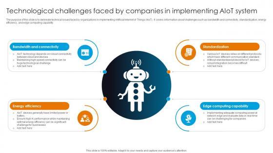 The purpose of this slide is to delineate technical issues faced by organizations in implementing Artificial Internet of Things AIoT. It covers information about challenges such as bandwidth and connectivity, standardization, energy efficiency, and edge computing capability. If your project calls for a presentation, then Slidegeeks is your go-to partner because we have professionally designed, easy-to-edit templates that are perfect for any presentation. After downloading, you can easily edit Integrating AI With IoT Technological Challenges Faced By Companies In Implementing IoT SS V and make the changes accordingly. You can rearrange slides or fill them with different images. Check out all the handy templates The purpose of this slide is to delineate technical issues faced by organizations in implementing Artificial Internet of Things AIoT. It covers information about challenges such as bandwidth and connectivity, standardization, energy efficiency, and edge computing capability.