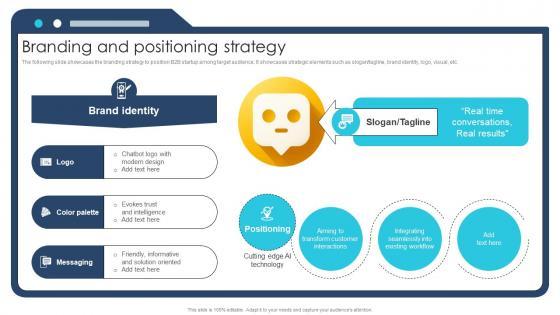 The following slide showcases the branding strategy to position B2B startup among target audience. It showcases strategic elements such as slogan or tagline, brand identity, logo, visual, etc.Boost your pitch with our creative Agenda For Ai Chatbot Service Market Entry Strategy. Deliver an awe-inspiring pitch that will mesmerize everyone. Using these presentation templates you will surely catch everyones attention. You can browse the ppts collection on our website. We have researchers who are experts at creating the right content for the templates. So you do not have to invest time in any additional work. Just grab the template now and use them. The following slide showcases the branding strategy to position B2B startup among target audience. It showcases strategic elements such as slogan or tagline, brand identity, logo, visual, etc.