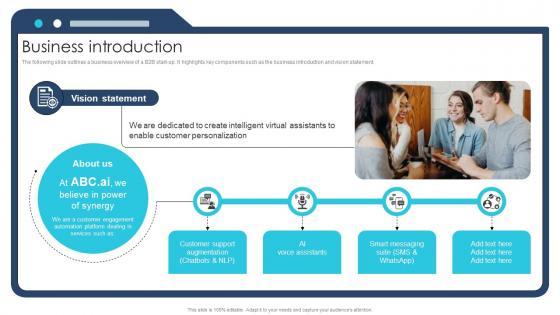 The following slide outlines a business overview of a B2B start-up. It highlights key components such as the business introduction and vision statement.Create an editable Business Introduction Ai Chatbot Service Market Entry Strategy that communicates your idea and engages your audience. Whether you are presenting a business or an educational presentation, pre-designed presentation templates help save time. Business Introduction Ai Chatbot Service Market Entry Strategy is highly customizable and very easy to edit, covering many different styles from creative to business presentations. Slidegeeks has creative team members who have crafted amazing templates. So, go and get them without any delay. The following slide outlines a business overview of a B2B start-up. It highlights key components such as the business introduction and vision statement.