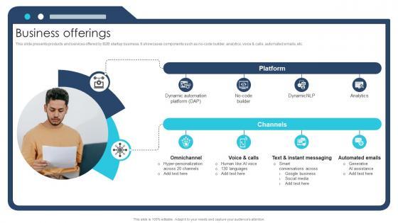 This slide presents products and services offered by B2B startup business. It showcases components such as no-code builder, analytics, voice and calls, automated emails, etc.Slidegeeks is one of the best resources for PowerPoint templates. You can download easily and regulate Business Offerings Ai Chatbot Service Market Entry Strategy for your personal presentations from our wonderful collection. A few clicks is all it takes to discover and get the most relevant and appropriate templates. Use our Templates to add a unique zing and appeal to your presentation and meetings. All the slides are easy to edit and you can use them even for advertisement purposes. This slide presents products and services offered by B2B startup business. It showcases components such as no-code builder, analytics, voice and calls, automated emails, etc.