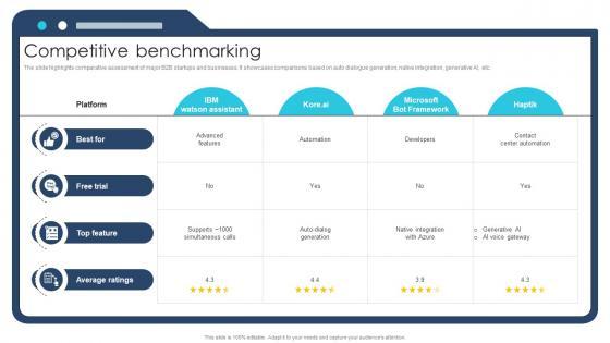 The slide highlights comparative assessment of major B2B startups and businesses. It showcases comparisons based on auto dialogue generation, native integration, generative AI, etc.Want to ace your presentation in front of a live audience Our Competitive Benchmarking Ai Chatbot Service Market Entry Strategy can help you do that by engaging all the users towards you. Slidegeeks experts have put their efforts and expertise into creating these impeccable powerpoint presentations so that you can communicate your ideas clearly. Moreover, all the templates are customizable, and easy-to-edit and downloadable. Use these for both personal and commercial use. The slide highlights comparative assessment of major B2B startups and businesses. It showcases comparisons based on auto dialogue generation, native integration, generative AI, etc.