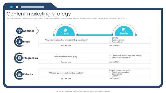 The slide showcases content marketing strategy for a B2B startup business to attract and retain audience. It highlights elements such as blog posts, infographics and e-books.There are so many reasons you need a Content Marketing Strategy Ai Chatbot Service Market Entry Strategy. The first reason is you can not spend time making everything from scratch, Thus, Slidegeeks has made presentation templates for you too. You can easily download these templates from our website easily. The slide showcases content marketing strategy for a B2B startup business to attract and retain audience. It highlights elements such as blog posts, infographics and e-books.
