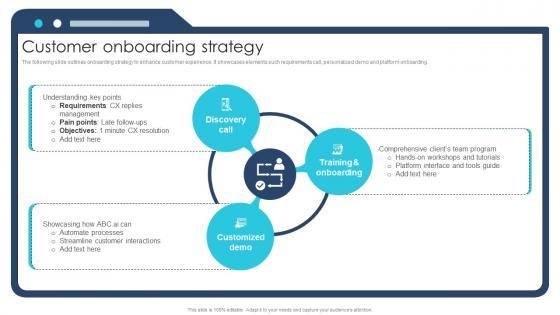 The following slide outlines onboarding strategy to enhance customer experience. It showcases elements such requirements call, personalized demo and platform onboarding.Get a simple yet stunning designed Customer Onboarding Strategy Ai Chatbot Service Market Entry Strategy. It is the best one to establish the tone in your meetings. It is an excellent way to make your presentations highly effective. So, download this PPT today from Slidegeeks and see the positive impacts. Our easy-to-edit Customer Onboarding Strategy Ai Chatbot Service Market Entry Strategy can be your go-to option for all upcoming conferences and meetings. So, what are you waiting for Grab this template today. The following slide outlines onboarding strategy to enhance customer experience. It showcases elements such requirements call, personalized demo and platform onboarding.