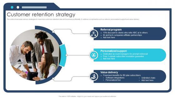 The slide showcases various strategies to maximize customer retention rate and business profitability. It outlines components such as referral, personalized support and value delivery.From laying roadmaps to briefing everything in detail, our templates are perfect for you. You can set the stage with your presentation slides. All you have to do is download these easy-to-edit and customizable templates. Customer Retention Strategy Ai Chatbot Service Market Entry Strategy will help you deliver an outstanding performance that everyone would remember and praise you for. Do download this presentation today. The slide showcases various strategies to maximize customer retention rate and business profitability. It outlines components such as referral, personalized support and value delivery.