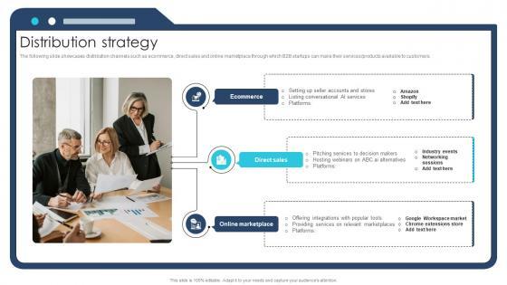 The following slide showcases distribution channels such as ecommerce, direct sales and online marketplace through which B2B startups can make their services or products available to customers.Present like a pro with Distribution Strategy Ai Chatbot Service Market Entry Strategy. Create beautiful presentations together with your team, using our easy-to-use presentation slides. Share your ideas in real-time and make changes on the fly by downloading our templates. So whether you are in the office, on the go, or in a remote location, you can stay in sync with your team and present your ideas with confidence. With Slidegeeks presentation got a whole lot easier. Grab these presentations today. The following slide showcases distribution channels such as ecommerce, direct sales and online marketplace through which B2B startups can make their services or products available to customers.