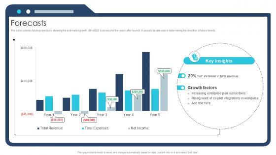 The slide outlines future projections showing the estimated growth of the B2B business for five years after launch. It assists businesses in determining the direction of future trends.Slidegeeks is here to make your presentations a breeze with Forecasts Ai Chatbot Service Market Entry Strategy With our easy-to-use and customizable templates, you can focus on delivering your ideas rather than worrying about formatting. With a variety of designs to choose from, you are sure to find one that suits your needs. And with animations and unique photos, illustrations, and fonts, you can make your presentation pop. So whether you are giving a sales pitch or presenting to the board, make sure to check out Slidegeeks first The slide outlines future projections showing the estimated growth of the B2B business for five years after launch. It assists businesses in determining the direction of future trends.