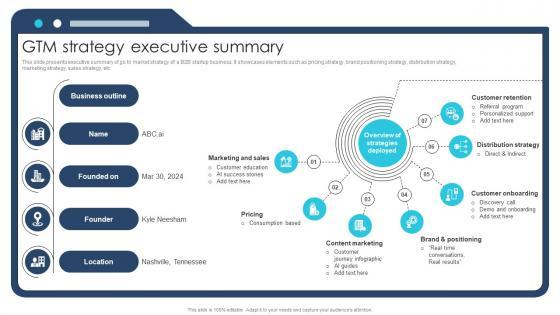 This slide presents executive summary of go to market strategy of a B2B startup business. It showcases elements such as pricing strategy, brand positioning strategy, distribution strategy,marketing strategy, sales strategy, etc.Whether you have daily or monthly meetings, a brilliant presentation is necessary. Gtm Strategy Executive Summary Ai Chatbot Service Market Entry Strategy can be your best option for delivering a presentation. Represent everything in detail using Gtm Strategy Executive Summary Ai Chatbot Service Market Entry Strategy and make yourself stand out in meetings. The template is versatile and follows a structure that will cater to your requirements. All the templates prepared by Slidegeeks are easy to download and edit. Our research experts have taken care of the corporate themes as well. So, give it a try and see the results. This slide presents executive summary of go to market strategy of a B2B startup business. It showcases elements such as pricing strategy, brand positioning strategy, distribution strategy,marketing strategy, sales strategy, etc.