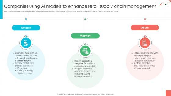This slide covers companies using machine learning models to enhance productivity in supply chain. It involves companies such as Amazon, Walmart and Afresh. Get a simple yet stunning designed Marketing Strategies For Effective Companies Using AI Models To Enhance Retail. It is the best one to establish the tone in your meetings. It is an excellent way to make your presentations highly effective. So, download this PPT today from Slidegeeks and see the positive impacts. Our easy-to-edit Marketing Strategies For Effective Companies Using AI Models To Enhance Retail can be your go-to option for all upcoming conferences and meetings. So, what are you waiting for Grab this template today. This slide covers companies using machine learning models to enhance productivity in supply chain. It involves companies such as Amazon, Walmart and Afresh.