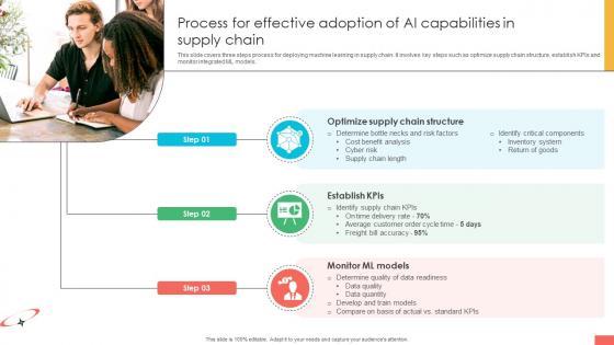 This slide covers three steps process for deploying machine learning in supply chain. It involves key steps such as optimize supply chain structure, establish KPIs and monitor integrated ML models. Here you can discover an assortment of the finest PowerPoint and Google Slides templates. With these templates, you can create presentations for a variety of purposes while simultaneously providing your audience with an eye-catching visual experience. Download Marketing Strategies For Effective Process For Effective Adoption Of Ai Capabilities to deliver an impeccable presentation. These templates will make your job of preparing presentations much quicker, yet still, maintain a high level of quality. Slidegeeks has experienced researchers who prepare these templates and write high-quality content for you. Later on, you can personalize the content by editing the Marketing Strategies For Effective Process For Effective Adoption Of Ai Capabilities. This slide covers three steps process for deploying machine learning in supply chain. It involves key steps such as optimize supply chain structure, establish KPIs and monitor integrated ML models.