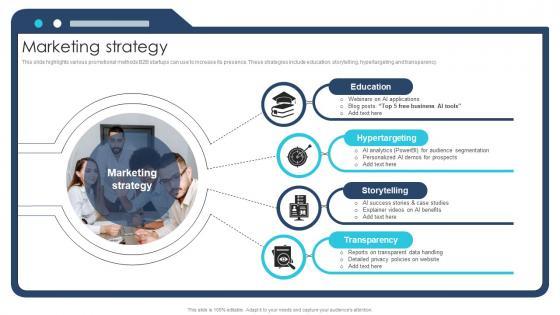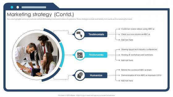 This slide highlights various promotional methods B2B startups can use to increase its presence. These strategies include testimonials, tech events and humanizing the brand.Are you in need of a template that can accommodate all of your creative concepts This one is crafted professionally and can be altered to fit any style. Use it with Google Slides or PowerPoint. Include striking photographs, symbols, depictions, and other visuals. Fill, move around, or remove text boxes as desired. Test out color palettes and font mixtures. Edit and save your work, or work with colleagues. Download Marketing Strategy Ai Chatbot Service Market Entry Strategy and observe how to make your presentation outstanding. Give an impeccable presentation to your group and make your presentation unforgettable. This slide highlights various promotional methods B2B startups can use to increase its presence. These strategies include testimonials, tech events and humanizing the brand.