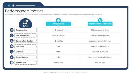 The following slide outlines various KPIs to track and measure B2B startups operational performance. The metrics are response time, user engagement, user rating, error rate, etc.Crafting an eye-catching presentation has never been more straightforward. Let your presentation shine with this tasteful yet straightforward Performance Metrics Ai Chatbot Service Market Entry Strategy template. It offers a minimalistic and classy look that is great for making a statement. The colors have been employed intelligently to add a bit of playfulness while still remaining professional. Construct the ideal Performance Metrics Ai Chatbot Service Market Entry Strategy that effortlessly grabs the attention of your audience Begin now and be certain to wow your customers The following slide outlines various KPIs to track and measure B2B startups operational performance. The metrics are response time, user engagement, user rating, error rate, etc.