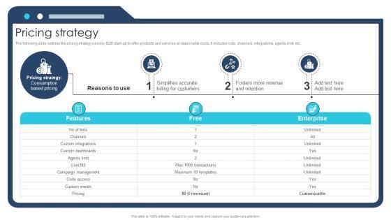 The following slide outlines the pricing strategy used by B2B start-up to offer products and services at reasonable costs. It includes bots, channels, integrations, agents limit, etc.Make sure to capture your audiences attention in your business displays with our gratis customizable Pricing Strategy Ai Chatbot Service Market Entry Strategy. These are great for business strategies, office conferences, capital raising or task suggestions. If you desire to acquire more customers for your tech business and ensure they stay satisfied, create your own sales presentation with these plain slides. The following slide outlines the pricing strategy used by B2B start-up to offer products and services at reasonable costs. It includes bots, channels, integrations, agents limit, etc.