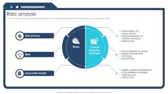 The slide outlines potential risks and challenges in B2B start-up business. It highlights components such as data privacy, bias and inaccurate results.Coming up with a presentation necessitates that the majority of the effort goes into the content and the message you intend to convey. The visuals of a PowerPoint presentation can only be effective if it supplements and supports the story that is being told. Keeping this in mind our experts created Risks Analysis Ai Chatbot Service Market Entry Strategy to reduce the time that goes into designing the presentation. This way, you can concentrate on the message while our designers take care of providing you with the right template for the situation. The slide outlines potential risks and challenges in B2B start-up business. It highlights components such as data privacy, bias and inaccurate results.
