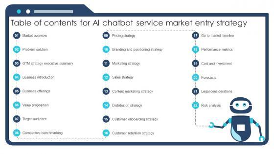 This modern and well-arranged Table Of Contents For Ai Chatbot Service Market Entry Strategy provides lots of creative possibilities. It is very simple to customize and edit with the Powerpoint Software. Just drag and drop your pictures into the shapes. All facets of this template can be edited with Powerpoint, no extra software is necessary. Add your own material, put your images in the places assigned for them, adjust the colors, and then you can show your slides to the world, with an animated slide included. Our Table Of Contents For Ai Chatbot Service Market Entry Strategy are topically designed to provide an attractive backdrop to any subject. Use them to look like a presentation pro.