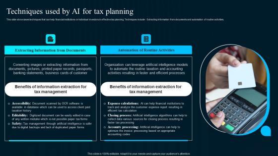 This slide showcases techniques that can help financial institutions or individual investors in effective tax planning. Techniques include Extracting information from documents and automation of routine activities.Are you in need of a template that can accommodate all of your creative concepts This one is crafted professionally and can be altered to fit any style. Use it with Google Slides or PowerPoint. Include striking photographs, symbols, depictions, and other visuals. Fill, move around, or remove text boxes as desired. Test out color palettes and font mixtures. Edit and save your work, or work with colleagues. Download Techniques Used By Ai For Tax Planning Artificial Intelligence Applications Infographics Pdf and observe how to make your presentation outstanding. Give an impeccable presentation to your group and make your presentation unforgettable. This slide showcases techniques that can help financial institutions or individual investors in effective tax planning. Techniques include Extracting information from documents and automation of routine activities.
