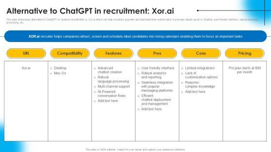 This slide showcases alternative to ChatGPT AI model in recruitment i.e. Xor.ai which can help recruiters augment and automate their routine tasks. It provides details about AI Chatbot, user friendly interface, natural language processing, etc.Create an editable Alternative To ChatGPT In Recruitment Xor Ai AI Powered Recruitment Enhancing Ppt Example AI SS V that communicates your idea and engages your audience. Whether you are presenting a business or an educational presentation, pre designed presentation templates help save time. Alternative To ChatGPT In Recruitment Xor Ai AI Powered Recruitment Enhancing Ppt Example AI SS V is highly customizable and very easy to edit, covering many different styles from creative to business presentations. Slidegeeks has creative team members who have crafted amazing templates. So, go and get them without any delay. This slide showcases alternative to ChatGPT AI model in recruitment i.e. Xor.ai which can help recruiters augment and automate their routine tasks. It provides details about AI Chatbot, user friendly interface, natural language processing, etc.