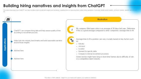 This slide showcases how ChatGPT can help recruiters build recruitment insights and narratives, assisting them in improving their routine hiring operations. It provides details about industry, job level, location, specific skill demand, etc.There are so many reasons you need a Building Hiring Narratives And AI Powered Recruitment Enhancing Ppt Example AI SS V. The first reason is you can not spend time making everything from scratch, Thus, Slidegeeks has made presentation templates for you too. You can easily download these templates from our website easily. This slide showcases how ChatGPT can help recruiters build recruitment insights and narratives, assisting them in improving their routine hiring operations. It provides details about industry, job level, location, specific skill demand, etc.