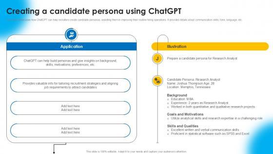 This slide showcases how ChatGPT can help recruiters create candidate personas, assisting them in improving their routine hiring operations. It provides details about communication skills, tone, language, etc.Present like a pro with Creating A Candidate Persona AI Powered Recruitment Enhancing Ppt Slide AI SS V. Create beautiful presentations together with your team, using our easy to use presentation slides. Share your ideas in real time and make changes on the fly by downloading our templates. So whether you are in the office, on the go, or in a remote location, you can stay in sync with your team and present your ideas with confidence. With Slidegeeks presentation got a whole lot easier. Grab these presentations today. This slide showcases how ChatGPT can help recruiters create candidate personas, assisting them in improving their routine hiring operations. It provides details about communication skills, tone, language, etc.