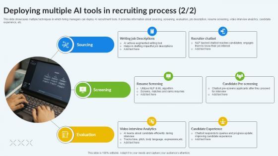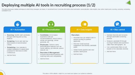 This slide showcases multiple techniques in which hiring managers can deploy AI recruitment tools. It provides information about automation, personalization, data insights, bias control, talent pools, sourcing, screening, scheduling, candidate fit, etc. Slidegeeks is here to make your presentations a breeze with Deploying Multiple AI Tools In Cloud Recruiting Technologies PPT Presentation With our easy-to-use and customizable templates, you can focus on delivering your ideas rather than worrying about formatting. With a variety of designs to choose from, you are sure to find one that suits your needs. And with animations and unique photos, illustrations, and fonts, you can make your presentation pop. So whether you are giving a sales pitch or presenting to the board, make sure to check out Slidegeeks first This slide showcases multiple techniques in which hiring managers can deploy AI recruitment tools. It provides information about automation, personalization, data insights, bias control, talent pools, sourcing, screening, scheduling, candidate fit, etc.