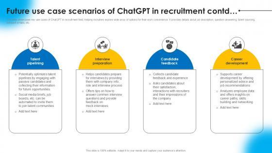 This slide showcases key use cases of ChatGPT in recruitment field, helping recruiters explore wide array of options for their work convenience. It provides details about job description, question answering, talent sourcing, outreach emails, etc.Do you have an important presentation coming up Are you looking for something that will make your presentation stand out from the rest Look no further than Future Use Case Scenarios Of AI Powered Recruitment Enhancing Ppt Template AI SS V. With our professional designs, you can trust that your presentation will pop and make delivering it a smooth process. And with Slidegeeks, you can trust that your presentation will be unique and memorable. So why wait Grab Future Use Case Scenarios Of AI Powered Recruitment Enhancing Ppt Template AI SS V today and make your presentation stand out from the rest This slide showcases key use cases of ChatGPT in recruitment field, helping recruiters explore wide array of options for their work convenience. It provides details about job description, question answering, talent sourcing, outreach emails, etc.