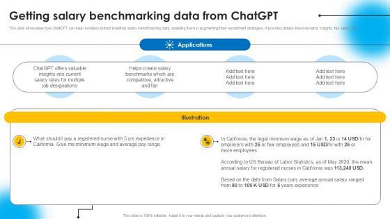 This slide showcases how ChatGPT can help recruiters extract industrial salary benchmarking data, assisting them in augmenting their recruitment strategies. It provides details about demand, insights, fair salary, etc.This modern and well arranged Getting Salary Benchmarking AI Powered Recruitment Enhancing Ppt Slide AI SS V provides lots of creative possibilities. It is very simple to customize and edit with the Powerpoint Software. Just drag and drop your pictures into the shapes. All facets of this template can be edited with Powerpoint, no extra software is necessary. Add your own material, put your images in the places assigned for them, adjust the colors, and then you can show your slides to the world, with an animated slide included. This slide showcases how ChatGPT can help recruiters extract industrial salary benchmarking data, assisting them in augmenting their recruitment strategies. It provides details about demand, insights, fair salary, etc.