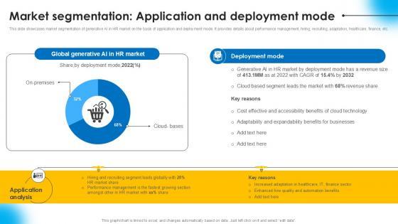 This slide showcases market segmentation of generative AI in HR market on the basis of application and deployment mode. It provides details about performance management, hiring, recruiting, adaptation, healthcare, finance, etc.Slidegeeks has constructed Market Segmentation Application AI Powered Recruitment Enhancing Ppt Slide AI SS V after conducting extensive research and examination. These presentation templates are constantly being generated and modified based on user preferences and critiques from editors. Here, you will find the most attractive templates for a range of purposes while taking into account ratings and remarks from users regarding the content. This is an excellent jumping off point to explore our content and will give new users an insight into our top notch PowerPoint Templates. This slide showcases market segmentation of generative AI in HR market on the basis of application and deployment mode. It provides details about performance management, hiring, recruiting, adaptation, healthcare, finance, etc.
