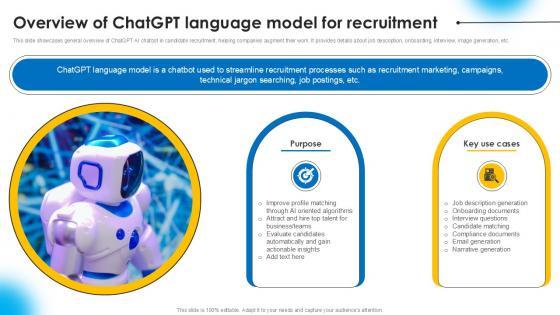 This slide showcases general overview of ChatGPT AI chatbot in candidate recruitment, helping companies augment their work. It provides details about job description, onboarding, interview, image generation, etc.Here you can discover an assortment of the finest PowerPoint and Google Slides templates. With these templates, you can create presentations for a variety of purposes while simultaneously providing your audience with an eye catching visual experience. Download Overview Of ChatGPT Language AI Powered Recruitment Enhancing Ppt Template AI SS V to deliver an impeccable presentation. These templates will make your job of preparing presentations much quicker, yet still, maintain a high level of quality. Slidegeeks has experienced researchers who prepare these templates and write high quality content for you. Later on, you can personalize the content by editing the Overview Of ChatGPT Language AI Powered Recruitment Enhancing Ppt Template AI SS V. This slide showcases general overview of ChatGPT AI chatbot in candidate recruitment, helping companies augment their work. It provides details about job description, onboarding, interview, image generation, etc.
