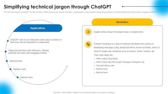 This slide showcases how ChatGPT can help recruiters simplify technical and complex information, assisting them in improving their routine hiring operations. It provides details about basic functions, engaging content, etc.Find a pre designed and impeccable Simplifying Technical Jargon AI Powered Recruitment Enhancing Ppt Template AI SS V. The templates can ace your presentation without additional effort. You can download these easy to edit presentation templates to make your presentation stand out from others. So, what are you waiting for Download the template from Slidegeeks today and give a unique touch to your presentation. This slide showcases how ChatGPT can help recruiters simplify technical and complex information, assisting them in improving their routine hiring operations. It provides details about basic functions, engaging content, etc.