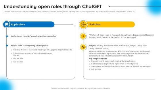 This slide showcases how ChatGPT can help recruiters understand open roles, assisting them in improving their routine hiring operations. It provides details about titles, responsibilities, jargons, etc.Want to ace your presentation in front of a live audience Our Understanding Open Roles Through AI Powered Recruitment Enhancing Ppt Example AI SS V can help you do that by engaging all the users towards you. Slidegeeks experts have put their efforts and expertise into creating these impeccable powerpoint presentations so that you can communicate your ideas clearly. Moreover, all the templates are customizable, and easy to edit and downloadable. Use these for both personal and commercial use. This slide showcases how ChatGPT can help recruiters understand open roles, assisting them in improving their routine hiring operations. It provides details about titles, responsibilities, jargons, etc.