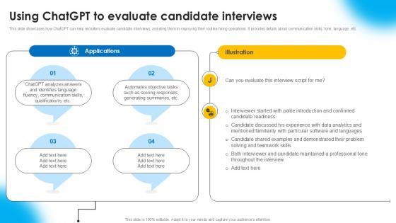 This slide showcases how ChatGPT can help recruiters evaluate candidate interviews, assisting them in improving their routine hiring operations. It provides details about communication skills, tone, language, etc.There are so many reasons you need a Using ChatGPT To Evaluate Candidate AI Powered Recruitment Enhancing Ppt PowerPoint AI SS V. The first reason is you can not spend time making everything from scratch, Thus, Slidegeeks has made presentation templates for you too. You can easily download these templates from our website easily. This slide showcases how ChatGPT can help recruiters evaluate candidate interviews, assisting them in improving their routine hiring operations. It provides details about communication skills, tone, language, etc.