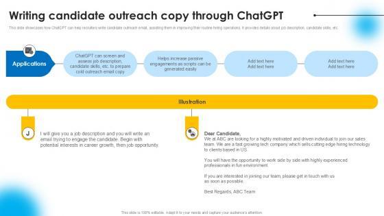 This slide showcases how ChatGPT can help recruiters write candidate outreach email, assisting them in improving their routine hiring operations. It provides details about job description, candidate skills, etc.Get a simple yet stunning designed Writing Candidate Outreach Copy AI Powered Recruitment Enhancing Ppt Sample AI SS V. It is the best one to establish the tone in your meetings. It is an excellent way to make your presentations highly effective. So, download this PPT today from Slidegeeks and see the positive impacts. Our easy to edit Writing Candidate Outreach Copy AI Powered Recruitment Enhancing Ppt Sample AI SS V can be your go to option for all upcoming conferences and meetings. So, what are you waiting for Grab this template today. This slide showcases how ChatGPT can help recruiters write candidate outreach email, assisting them in improving their routine hiring operations. It provides details about job description, candidate skills, etc.