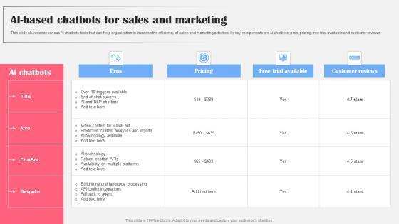 This slide showcases various AI chatbots tools that can help organization to increase the efficiency of sales and marketing activities. Its key components are AI chatbots, pros, pricing, free trial available and customer reviews This AI Based Chatbots For Sales And Marketing AI Bot Application For Various Industries Inspiration Pdf is perfect for any presentation, be it in front of clients or colleagues. It is a versatile and stylish solution for organizing your meetings. The AI Based Chatbots For Sales And Marketing AI Bot Application For Various Industries Inspiration Pdf features a modern design for your presentation meetings. The adjustable and customizable slides provide unlimited possibilities for acing up your presentation. Slidegeeks has done all the homework before launching the product for you. So, do not wait, grab the presentation templates today This slide showcases various AI chatbots tools that can help organization to increase the efficiency of sales and marketing activities. Its key components are AI chatbots, pros, pricing, free trial available and customer reviews