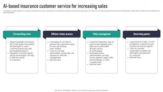 This slide showcases usage of AI in insurance company that can help organization to provide effective customer service and increase sales. Use case of AI in insurance customer service are personalized sales, efficient claims process, policy management and quotes generation. Present like a pro with AI Based Insurance Customer Service For Increasing Sales Guidelines Pdf Create beautiful presentations together with your team, using our easy-to-use presentation slides. Share your ideas in real-time and make changes on the fly by downloading our templates. So whether you are in the office, on the go, or in a remote location, you can stay in sync with your team and present your ideas with confidence. With Slidegeeks presentation got a whole lot easier. Grab these presentations today. This slide showcases usage of AI in insurance company that can help organization to provide effective customer service and increase sales. Use case of AI in insurance customer service are personalized sales, efficient claims process, policy management and quotes generation.